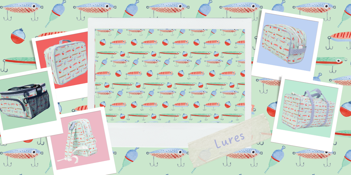 A lively mix of hand-drawn lures, bobbers, and little fishing details — bright pops of color against a soft mint backdrop. A cheerful, lighthearted print that brings an easy dose of fun to any day.