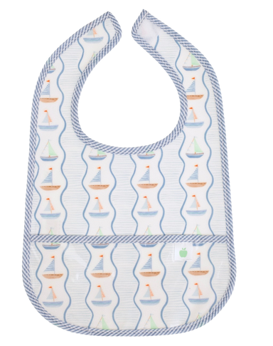 A charming lineup of hand-painted sailboats drifting between wavy blue stripes — soft greens, sandy neutrals, and classic nautical blues bringing all the breezy, coastal sweetness. A light and cheerful pattern that feels like a sunny day by the water.